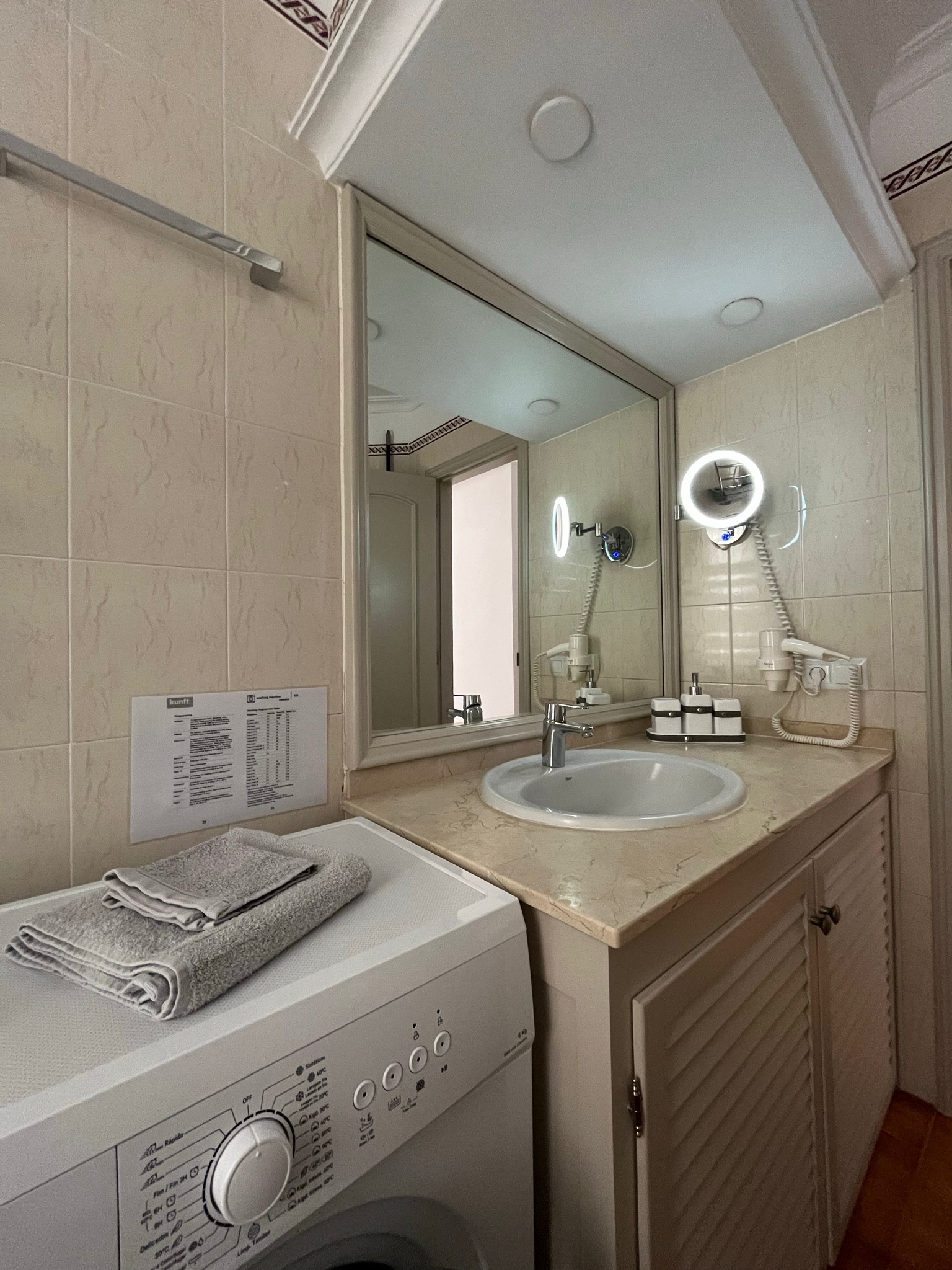 Koupelna je vybavena WC, bidetem, vanou se sprchovací skleněnou zástěnou, novou pračkou, fénem Valera, zvětšovacím LED zrcadlem, k dispozici jsou ručníky, osušky, malé ručníky i osušky k bazénu. Sušák na prádlo, žehlička + prkno, úklidové potřeby.