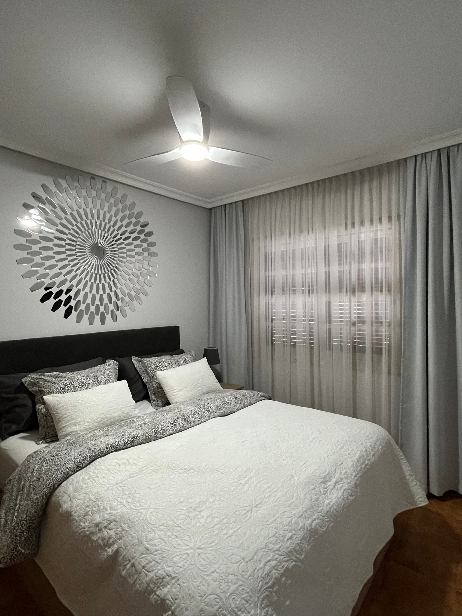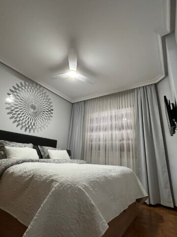 V ložnici je nová vyšší postel velikosti 160 cm, vybavená vysokou kvalitní matrací a topperem, noční stolky, TV, trezor, šatní skříň, lampičky, nový stropní větrák s letním a zimním modem. K dispozici je povlečení, sady polštářů a přehozy.
